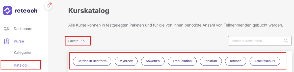 1. Navigieren Sie zu Kurse > Katalog und wählen Sie anschließend den Content-Partner aus, bei dem Sie die Kurse erworben haben.