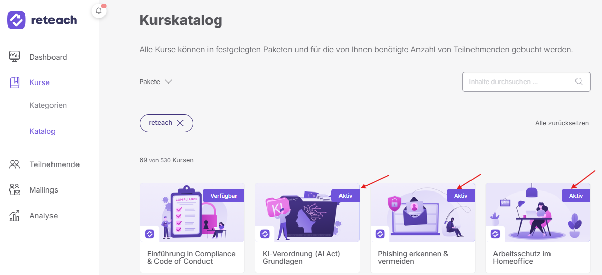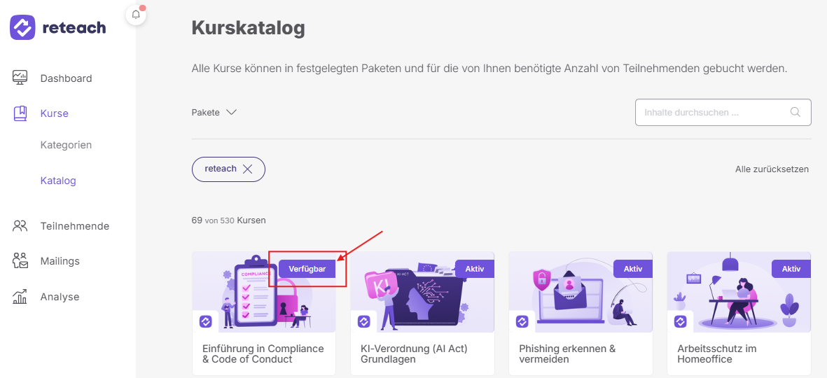3. Zusätzlich werden Ihnen hier alle Kurse angezeigt, die für Sie verfügbar, aber noch nicht aktiviert sind.