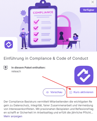 Mit einem Klick auf den verfügbaren Kurs können Sie diesen über den Button "Kurs aktivieren" zu Ihren eigenen Kursen hinzufügen. Sie finden den Kurs anschließend im Hauptmenü unter Kurse.